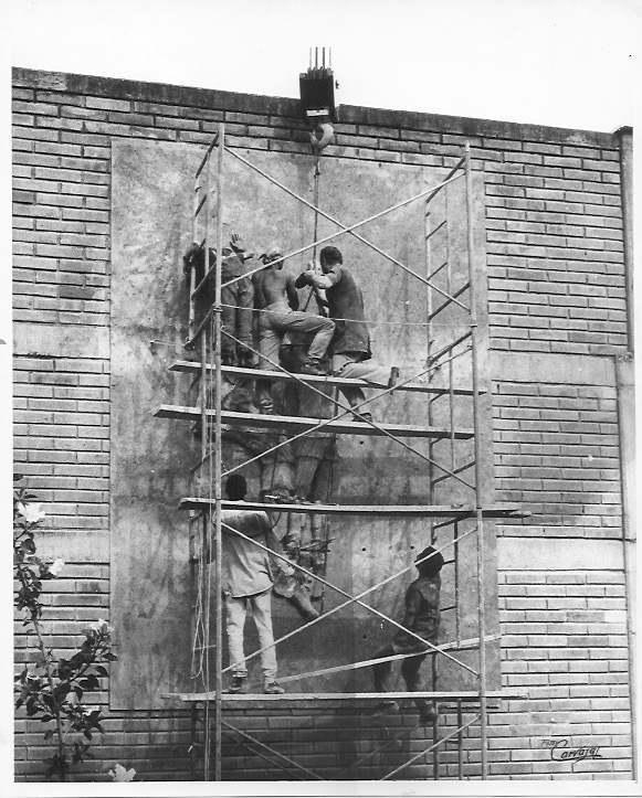 Luego los moldes de yeso fueron destruidos y a los relieves se les hizo limpieza y resane para luego con una grúa izarlos y colocarlos en su sitio.