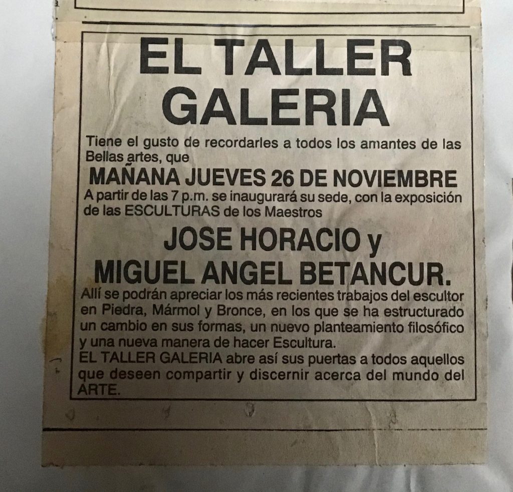 Para el año 1992 realizé una exposición individual como inauguración de mi Taller-Galeria en barrio Laureles de Medellin con obras en diferentes técnicas y materiales como piedra, bronce y técnica mixta piedra y hierro, en ésta exposición se muestra por primera vez mis bronces martillados además se muestra la serie de las Esclavas: La Esclava del Silencio- La esclava de los recuerdos- La del Secreto- La de las Cadenas- la de las Formas entre otras. Se muestran las esculturas-mesas en piedra y bronce, fue una exposición llena de vitalidad la presentación estuvo a cargo de Santiago Castro Agudelo donde leyó el Poema de su autoría “Tú y tú padre compañero”.