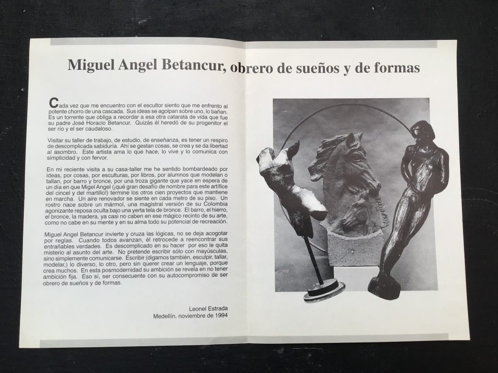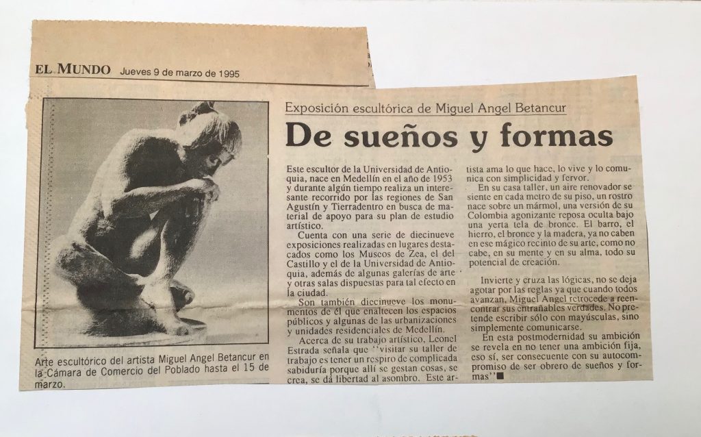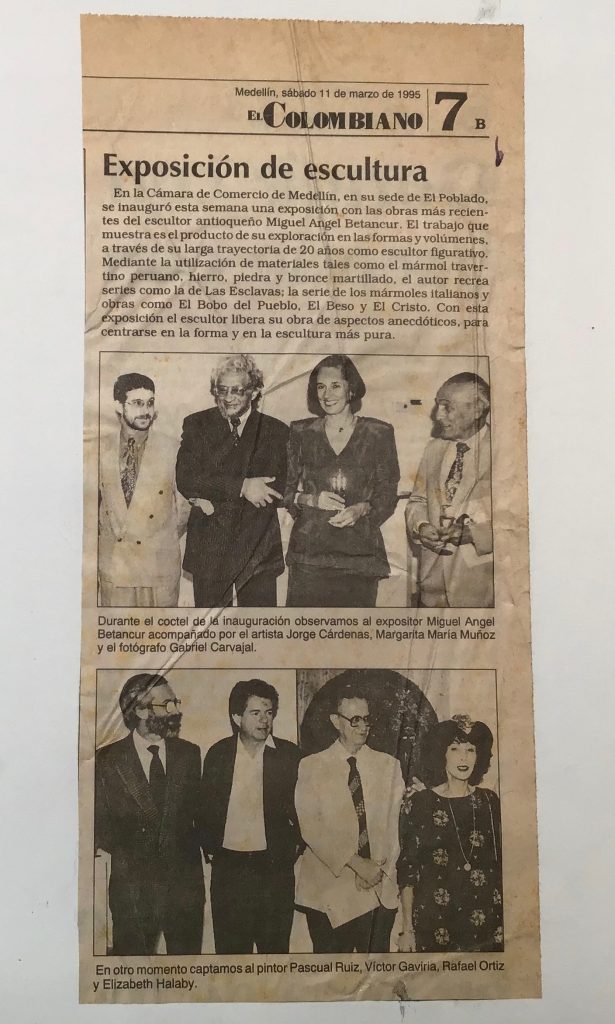 Para el año 1995 expuse individualmente en la Cámara de Comercio de Medellin sede El Poblado, 40 esculturas: entre bronces martillados de la serie de las esclavas, los mármoles italianos en bajo y alto relieves tratados como un todo tridimensional muy distintos en su tratamiento a los presentados tiempo atrás en la sede del centro.