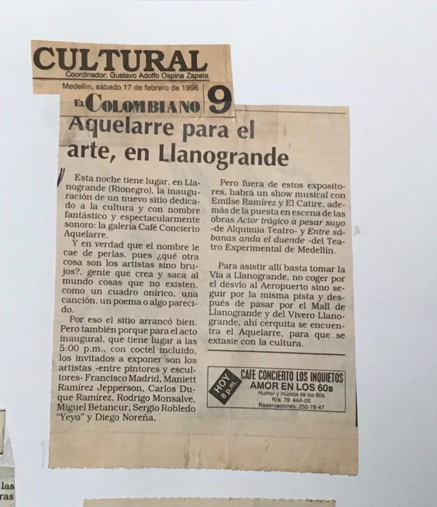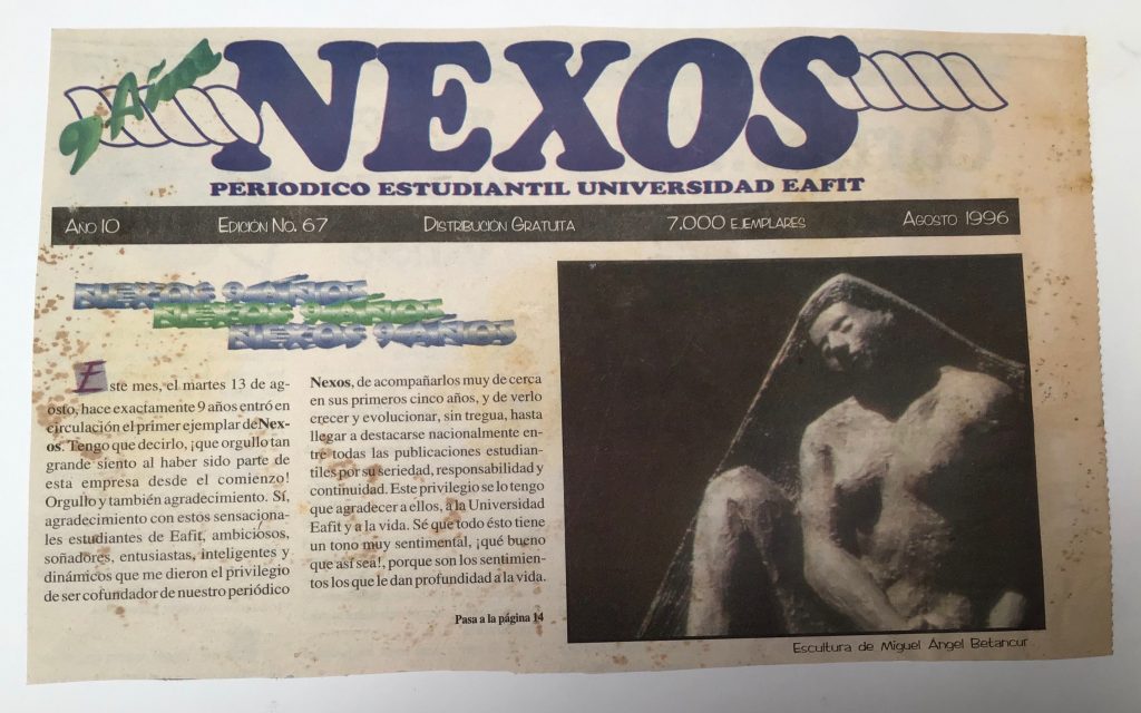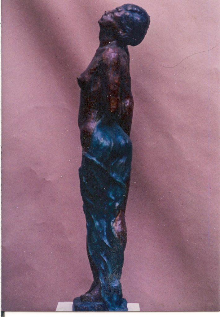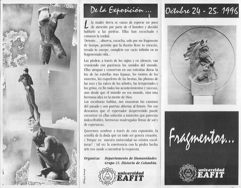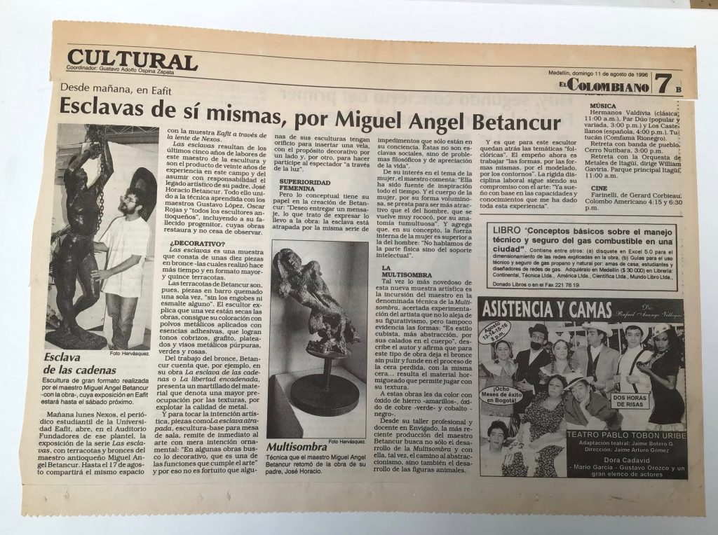 En el año de 1996 llevé mis esculturas a los corredores de la Universidad EAFIT con una muestra denominada “Fragmentos” y luego llevé al Auditorio Fundadores de la misma Universidad la exposición denominada “Las esclavas” la muestra consistía en una serie de 10 esclavas en bronce martillado de formato grande y 15 esculturas en terracota de pequeño formato.