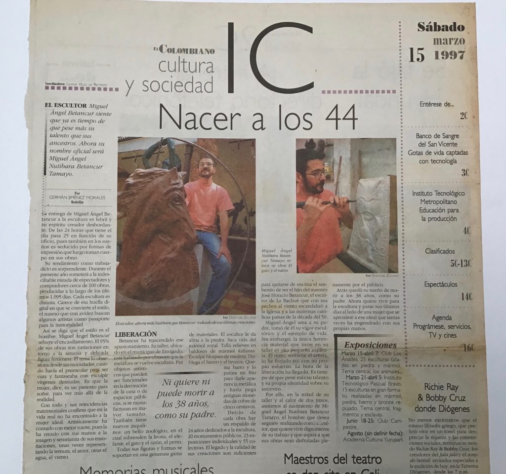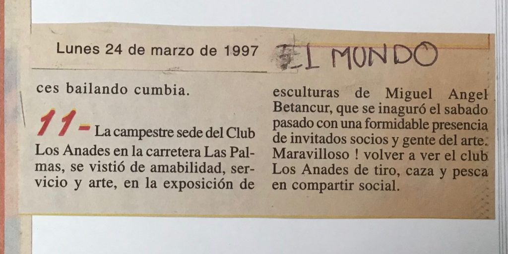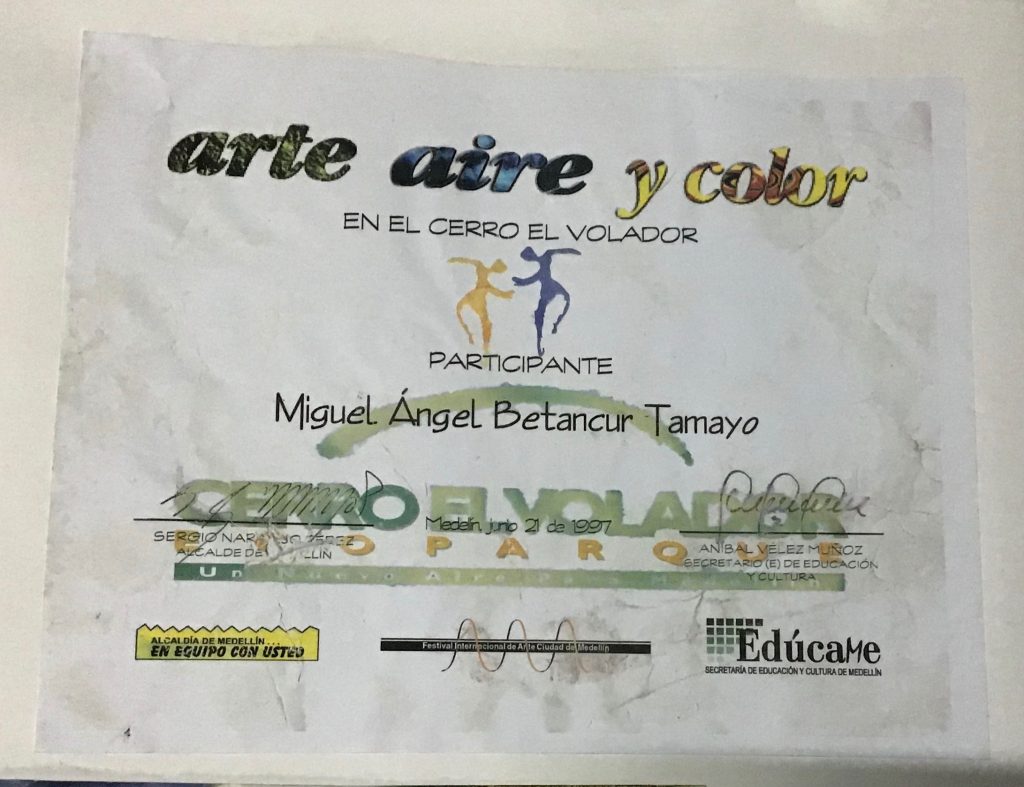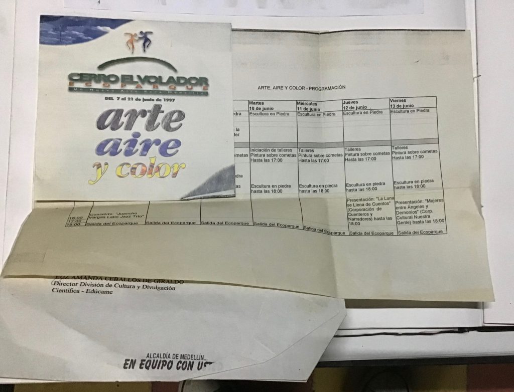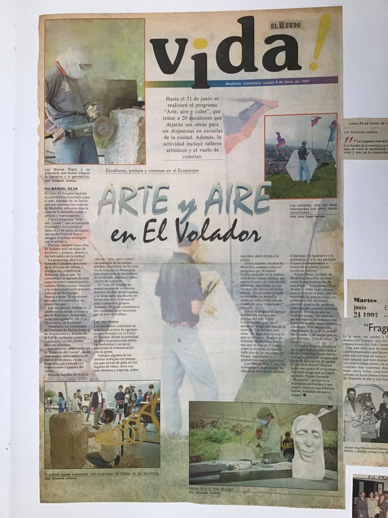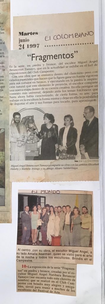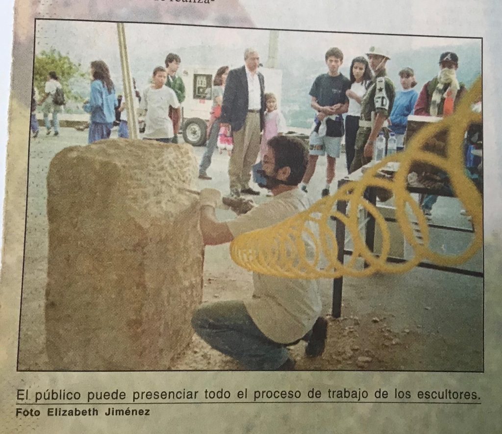 Es de resaltar que este año, 1997 en el Festival Internacional de Arte de la ciudad de Medellín participé en el programa “Arte-Aire y Color” realizado en el Cerro el Volador, tallé un bloque de piedra e hice una escultura de la región de Barichara Santander titulada “La espera” junto con otros 20 escultores de toda Colombia.