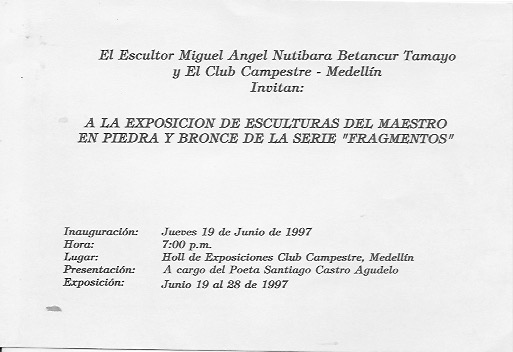 Otra titulada en 1997 “Fragmentos, piedra y bronce” en el Club Campestre de Medellin tema central las multisombras en bronce y las bailarinas.