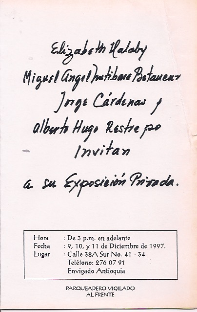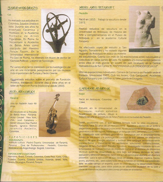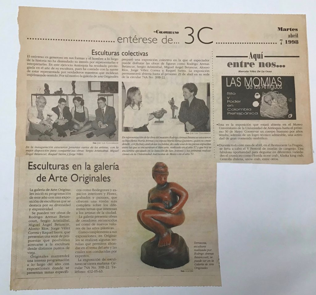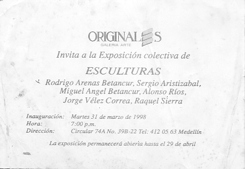 En 1998 participé en dos muestras colectivas una de Escultores en la Galeria Originales en el barrio Laureles y la otra de Artistas de la U.P.B.