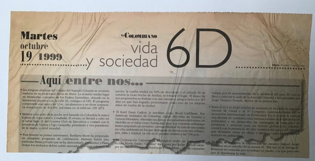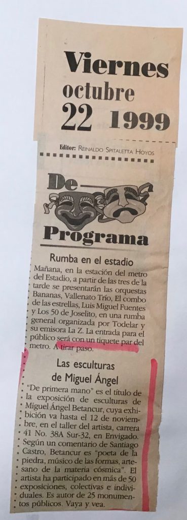 En el año 1999 expuse individualmente en mi Taller-Galeria de Envigado una muestra que llamé “De primera Mano” con esculturas en diversos materiales como el barro, el hierro, el cobre, la madera, la piedra, el granito esmerilado y el mármol, destacándose la presencia alli de la serie de “Reminiscencias o recuerdos” son esculturas en terracota de gran formato, con figuras femeninas que recuerdan los juegos de infancia como “Pipo y cuarta”, “Catapiz”, “Me quiere…no me quiere”, “Sueños de infancia”, “Ecos de mi tierra”, “El carrito”, “La Magdalena”, “Ella”, “La bañista”, otras en piedra y en monedas de cobre como: “La modelo”, “Maternidad”; “Libertad”, “Cabeza de Toro”, “Torso femenino” entre otras, fue una exposición presentada por el Señor Alcalde de Envigado Héctor Londoño.