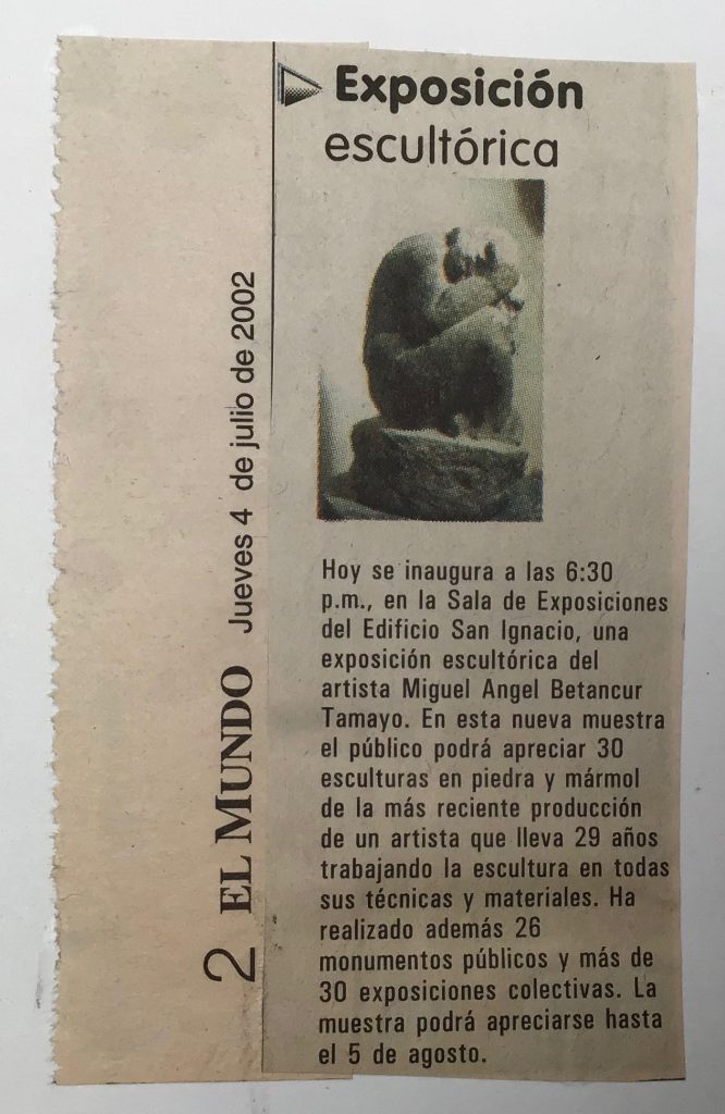 Ya en el 2002 expuse individualmente 32 esculturas en piedra y mármol en el Paraninfo de la Universidad de Antioquia, Edificio San Ignacio en ésta exposición me afino más a la idea de ser heredero de la escultura Agustiniana por el emblocamiento y el tratamiento dado a cada escultura ya sea su constitución en piedra o en mármol.