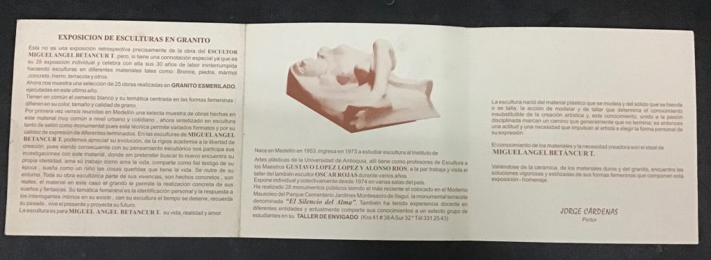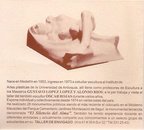 Ya en el año 2003 expuse 25 esculturas en granito esmerilado, por primera vez en nuestra ciudad se ve una exposición de ésta indole, había obras en todos los tamaños y colores, el tema central la Mujer y sus expresiones. El Granito es un material de uso cotidiano y urbano ahora sintetizado en la escultura. La exposición se llevó acabo en la Cámara de Comercio de Medellin sede el Poblado, obras todas realizadas en el taller de Envigado. En ésta exposición presenté además de las 25 esculturas de granito el yeso de la primera escultura de mujer que realicé cuando era estudiante en el Instituto se llama “Dulces recuerdos” para hacer un puente entre la academia y la obra en granito del momento.