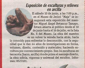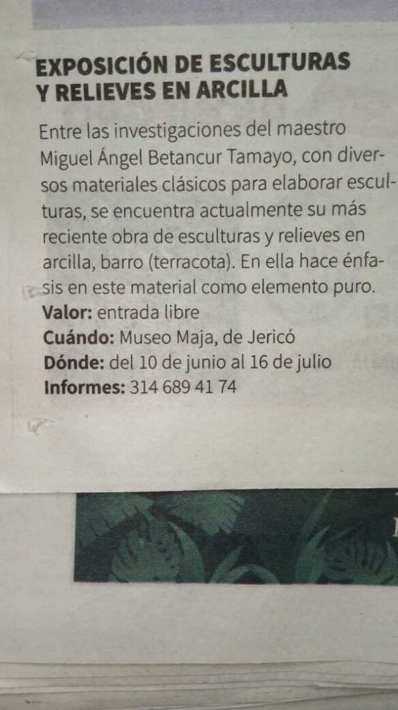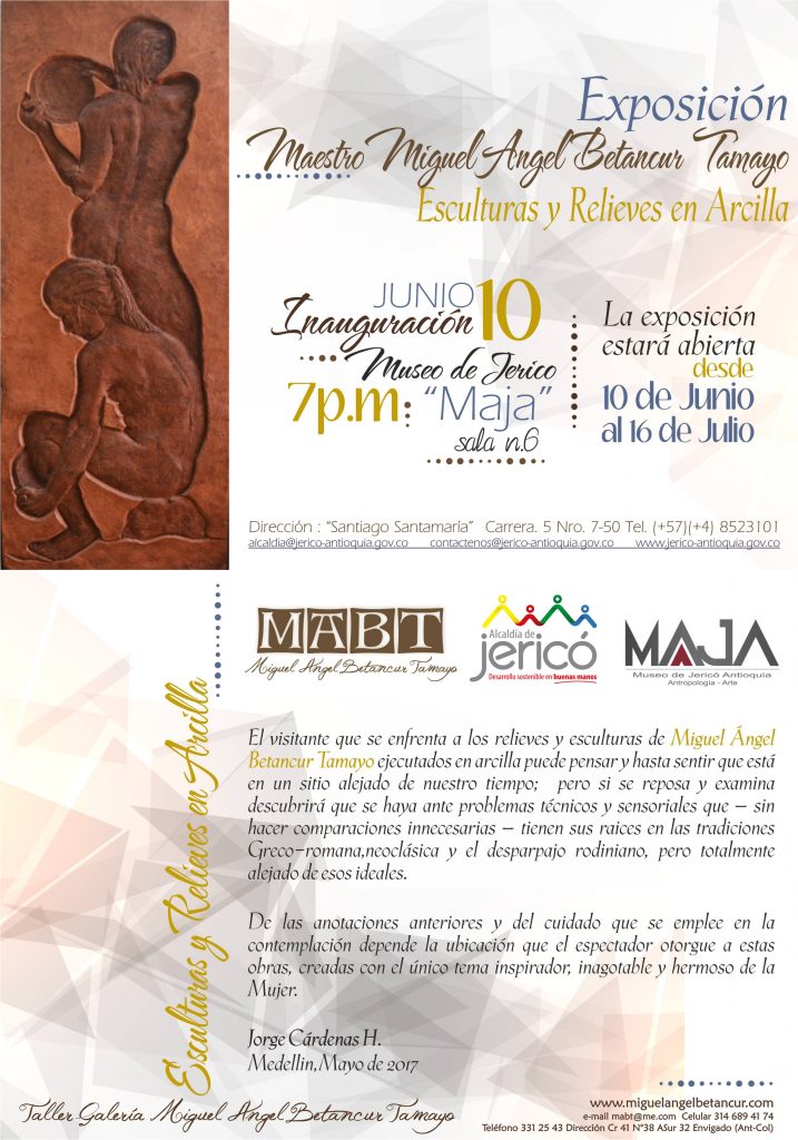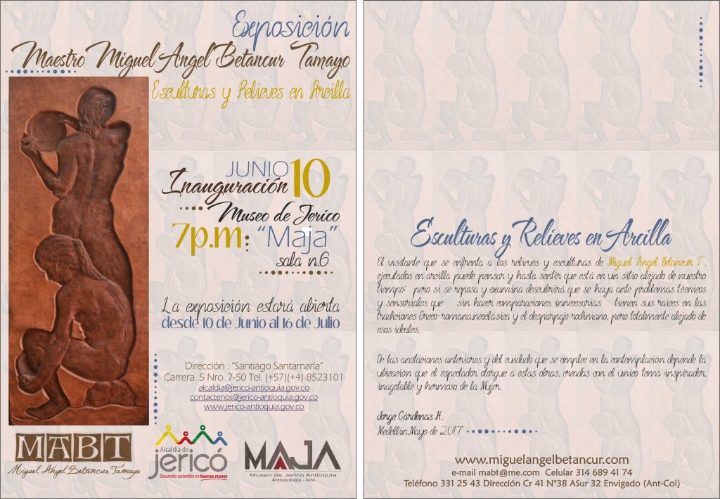 En el año 2017 llevé una exposición individual de Esculturas y Relieves en terracota en pequeño y gran formato al Municipio de Jericó al Museo de Antropología y Artes “Maja” por invitación del Doctor Roberto Ojalvo Director del Museo.