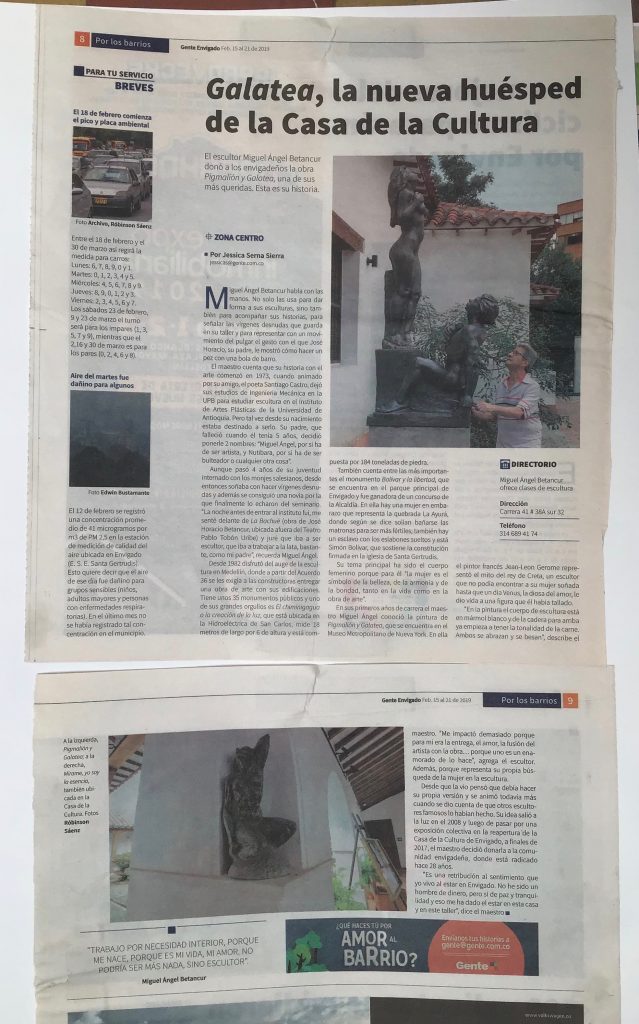 En el año 2019 regalé al Municipio de Envigado la escultuta denominada por mi “Pigmaleon y Galatea” una escultura en concreto patinado y reforzado de 2.00 mts de altura para la Casa de La Cultura del Municipio obra que la había hecho en el año 2010. como la maxima expresión del amor del artista por su obra y su entrega total a ella.