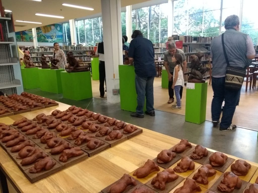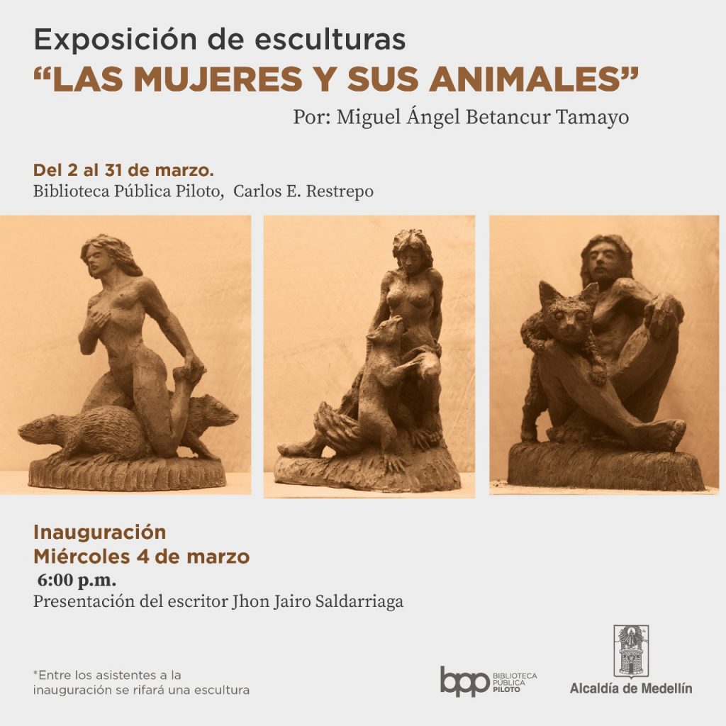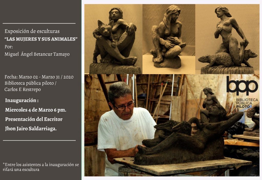 En el año 2020 inauguré el 4 de Marzo una exposición individual en la Biblioteca Pública Piloto de Medellin sede Carlos E. Restrepo denominada “Las mujeres y sus animales” con obra reciente en terracota y presentada por el Escritor John Jairo Saldarriaga con tan mala suerte que a la semana siguiente de la inauguración quedó confinada por la pandemia del coronavirus, es una exposición de 20 esculturas donde cada mujer está acompañada de un animal vemos entonces a mis perros Ema y Pablo, lo mismo que a la iguana, al gato, a las guaguas, al conejo, al gallinazo, al cisne, a la serpiente, al jaguar, a la ardilla, a la tortuga, a la rana entre otros, todo un homenaje a la mujer y a la naturaleza en animales que de alguna manera han tenido que ver conmigo.