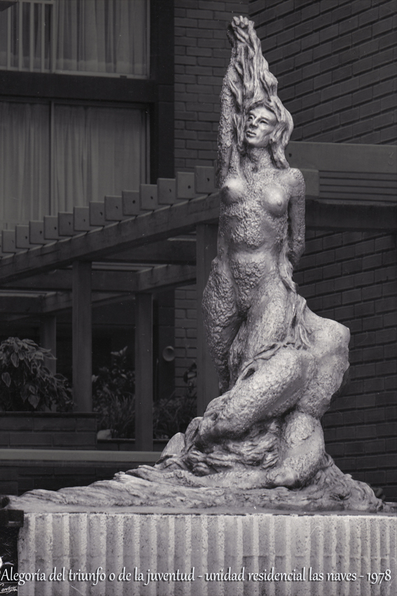 La “ALEGORÍA DE LA JUVENTUD O EL TRIUNFO” en el año de 1978 para la Unidad Residencial Las Naves # 2 en concreto patinado de 3 mts de altura y realizada también en los laboratorios de Ingeniería Mecánica de la U.P.B. el modelado y el vaciado se hizo en el propio edificio.