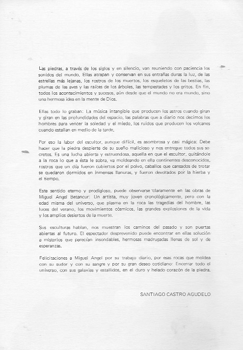 En 1981 llevé mis esculturas a la fabrica de SIMESA la Empresa Siderúrgica por excelencia de Medellín, la presentación de la exposición me la hizo mi amigo Santiago Castro Agudelo allí presenté esculturas en yeso y piedra.