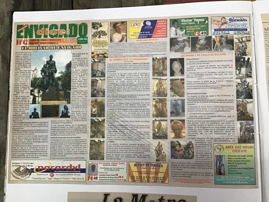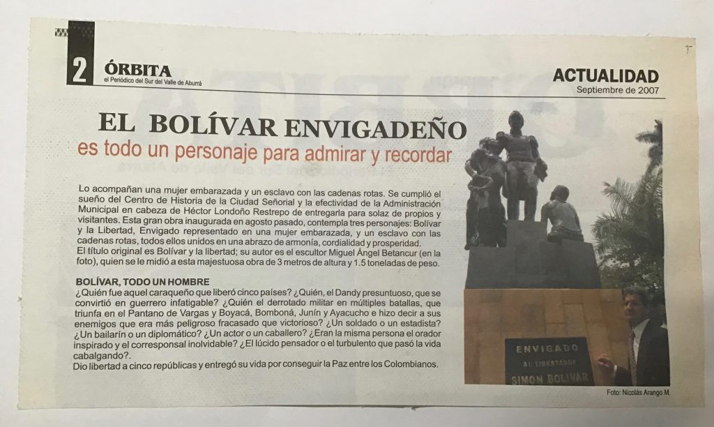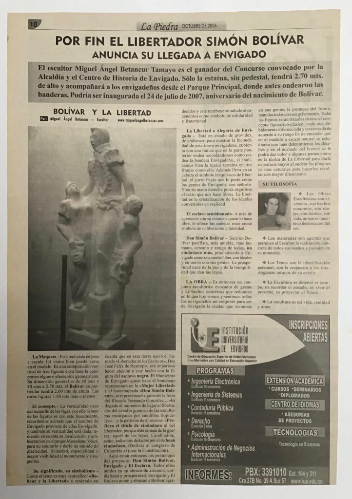 En el año** 2006** comienzo la escultura “BOLIVAR Y LA LIBERTAD” para el Parque Principal Marceliano Vélez de Envigado que me fue adjudicada por concurso, una obra de 3 mts de altura en bronce y modelada en barro en mi taller de Envigado, el proceso de la realización de toda la obra demoro nueve meses y en el año 2007se inauguró por parte de la primera autoridad del Municipio El Señor Alcalde Héctor Londoño y sus secretarios de Gabinete con presencia además de los miembros del Concejo y los miembros del Centro de Historia de Envigado y como representante de la Academia de Historia de Medellin estuvo presente el Doctor José María Bravo Betancur.