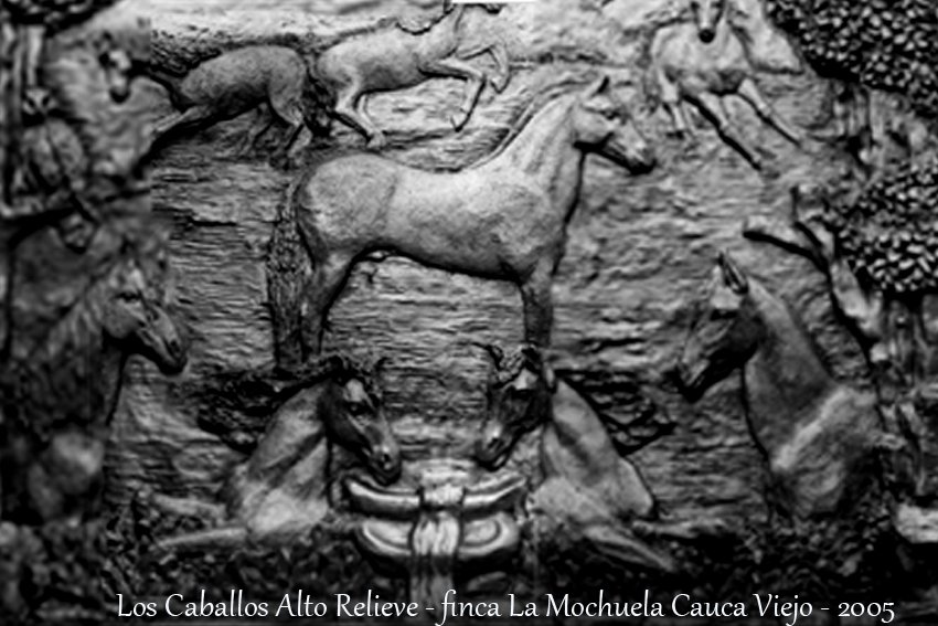 Para el año** 2008** modelé en el muro posterior del taller de Envigado el mural en alto-relieve “LOS CABALLOS” para la Finca La Mochuela en Cauca Viejo del Suroeste Antioqueño. Se modelo en barro y los alumnos del momento ayudaron en el proceso de sacar los moldes en yeso para luego llevarlos a su sitio y hacer el vaciado en concreto, el relieve tiene 5 mts de largo por 4 mts de alto y son ocho caballos en una composición libre y espontánea.
