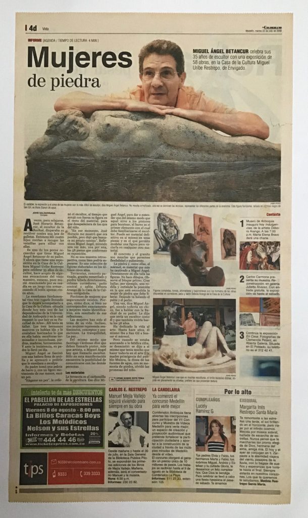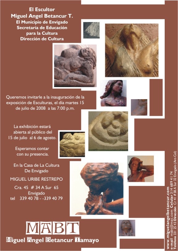 En el año 2008 realicé una exposición individual de esculturas en la Casa de la Cultura Miguel Uribe Restrepo de Envigado, presenté 58 esculturas elaboradas en los 5 últimos años en materiales como la terracota, el granito esmerilado y la piedra, llenaban los corredores, el patio central y el salón Débora Arango, alli se vieron en su verdadera dimensión los altos relieves en granito esmerilado.