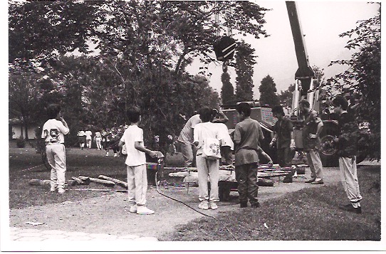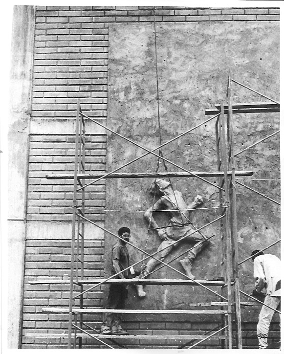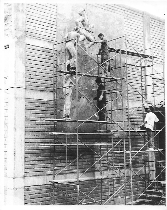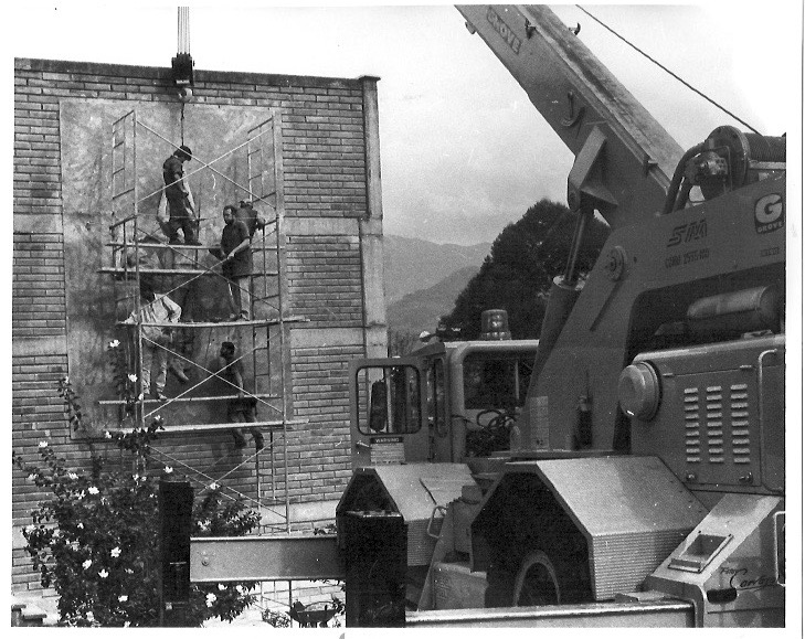 Luego los moldes de yeso fueron destruidos y a los relieves se les hizo limpieza y resane para luego con una grúa izarlos y colocarlos en su sitio.