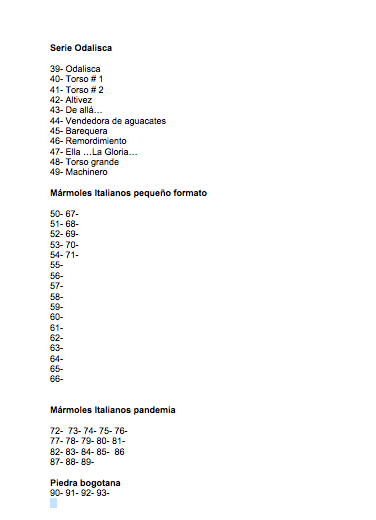 A esta serie la acompañan esculturas en piedra de gran formato y una serie de mármoles italianos obras realizadas en estos últimos años y la exposición se complementa con una serie de fotografías de la obra monumental, son la acumulación de 48 años dedicados de lleno a la escultura.