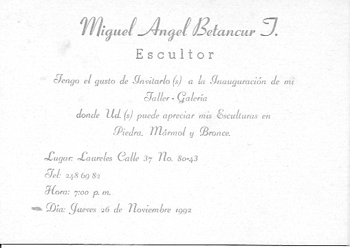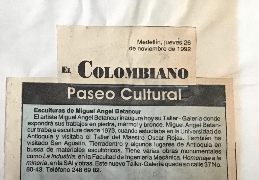 Para el año 1992 realizé una exposición individual como inauguración de mi Taller-Galeria en barrio Laureles de Medellin con obras en diferentes técnicas y materiales como piedra, bronce y técnica mixta piedra y hierro, en ésta exposición se muestra por primera vez mis bronces martillados además se muestra la serie de las Esclavas: La Esclava del Silencio- La esclava de los recuerdos- La del Secreto- La de las Cadenas- la de las Formas entre otras. Se muestran las esculturas-mesas en piedra y bronce, fue una exposición llena de vitalidad la presentación estuvo a cargo de Santiago Castro Agudelo donde leyó el Poema de su autoría “Tú y tú padre compañero”.