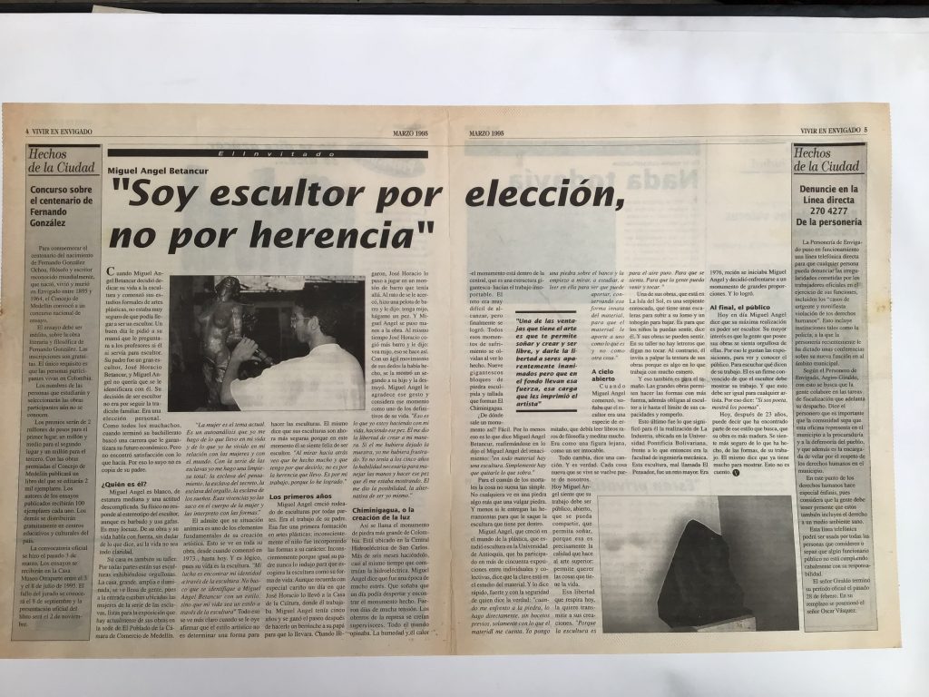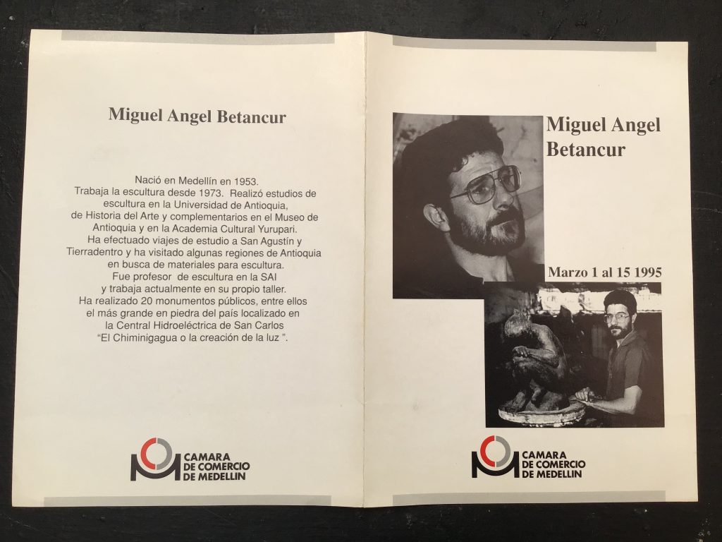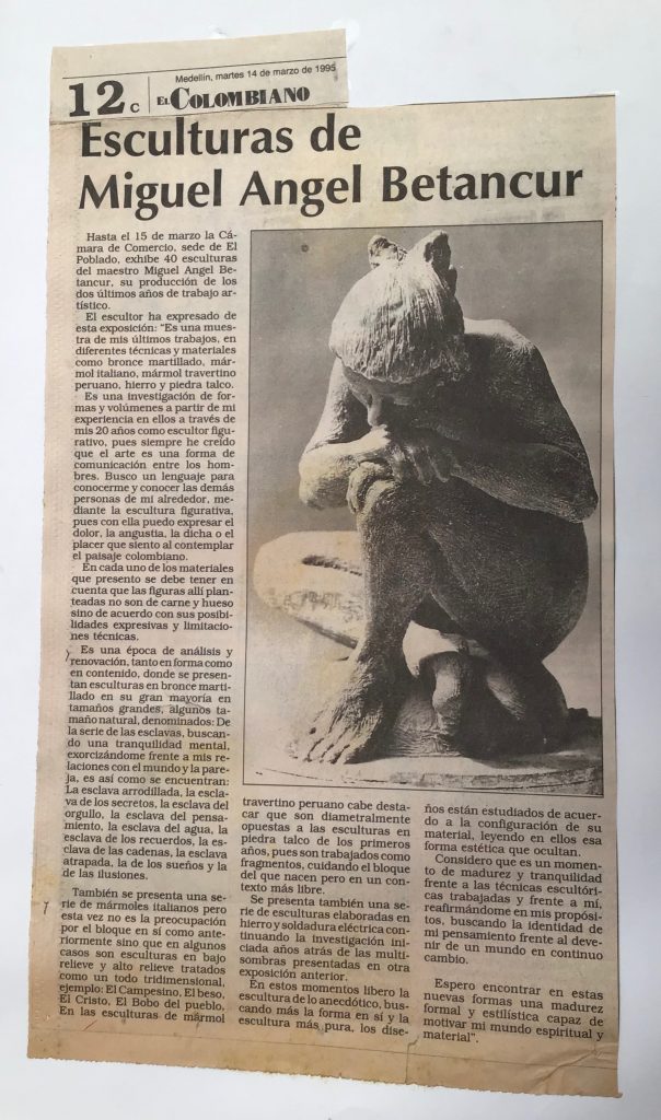 Para el año 1995 expuse individualmente en la Cámara de Comercio de Medellin sede El Poblado, 40 esculturas: entre bronces martillados de la serie de las esclavas, los mármoles italianos en bajo y alto relieves tratados como un todo tridimensional muy distintos en su tratamiento a los presentados tiempo atrás en la sede del centro.