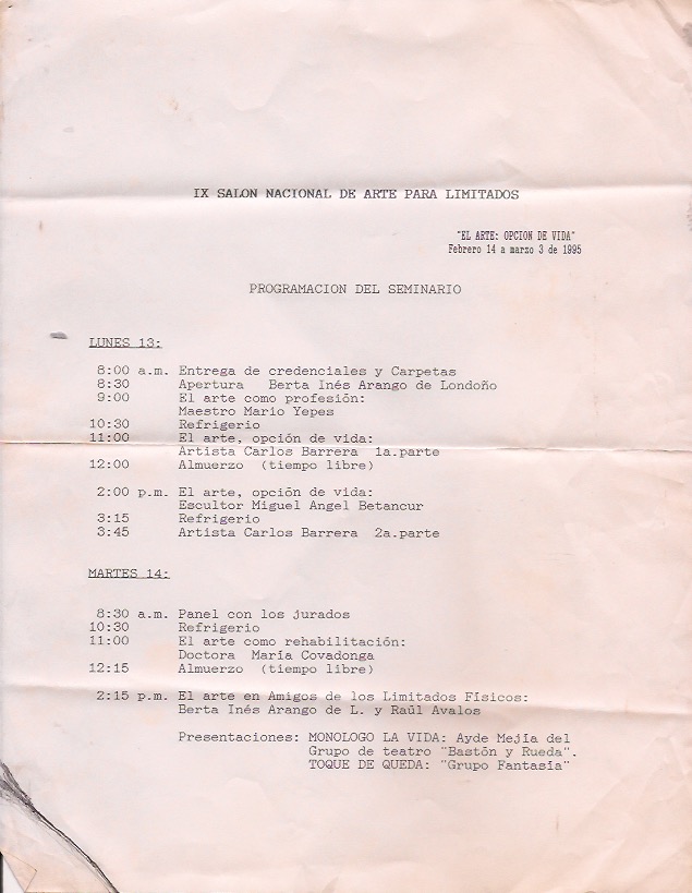 En el año 1995 tuve una experiencia bien interesante en la participacion y disertación en la exposición de los Amigos de los limitados Fisicos en Suramericana, alli hablé y puse como ejemplo de superación al Escultor brasilero Francisco Lisboa el “Aleijadinho” quien a pesar de sufrir de lepra trabajó incansablemente la escultura produciendo grandes obras en tamaños descomunales , de Ouro preto en Mina Gerais trabajó todos los pasos del viacrucis y las esculturas gigantes de los profetas y decoró inumerables Iglesias.