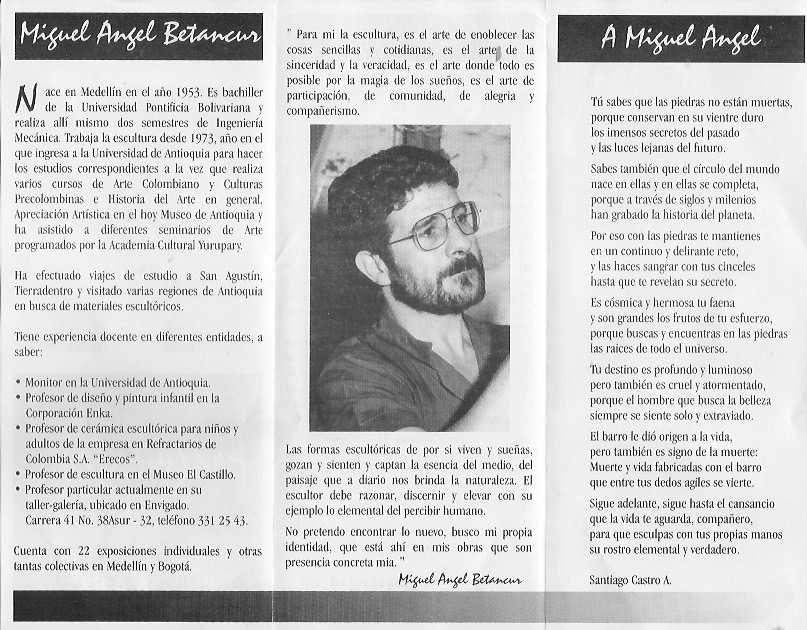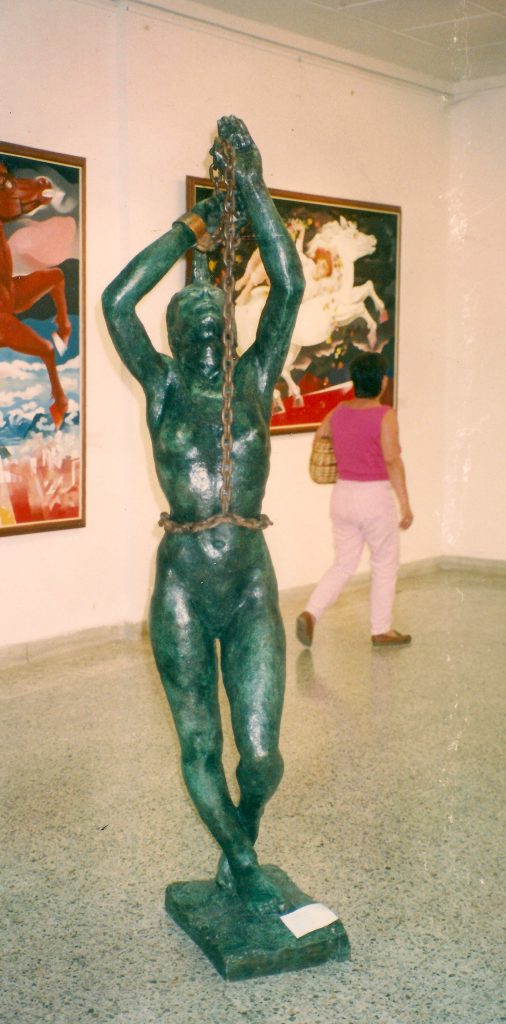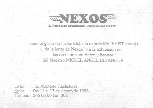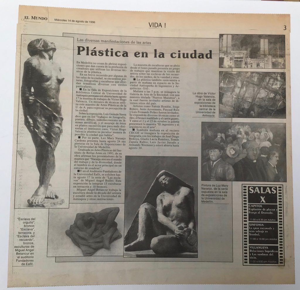 En el año de 1996 llevé mis esculturas a los corredores de la Universidad EAFIT con una muestra denominada “Fragmentos” y luego llevé al Auditorio Fundadores de la misma Universidad la exposición denominada “Las esclavas” la muestra consistía en una serie de 10 esclavas en bronce martillado de formato grande y 15 esculturas en terracota de pequeño formato.