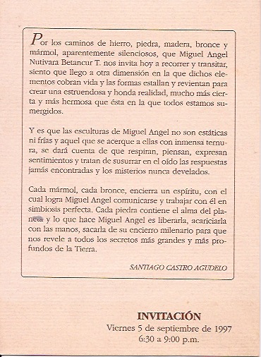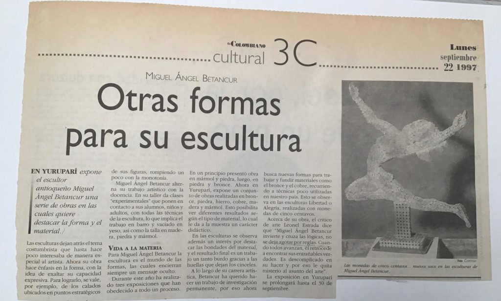 Es de resaltar que este año, 1997 en el Festival Internacional de Arte de la ciudad de Medellín participé en el programa “Arte-Aire y Color” realizado en el Cerro el Volador, tallé un bloque de piedra e hice una escultura de la región de Barichara Santander titulada “La espera” junto con otros 20 escultores de toda Colombia.