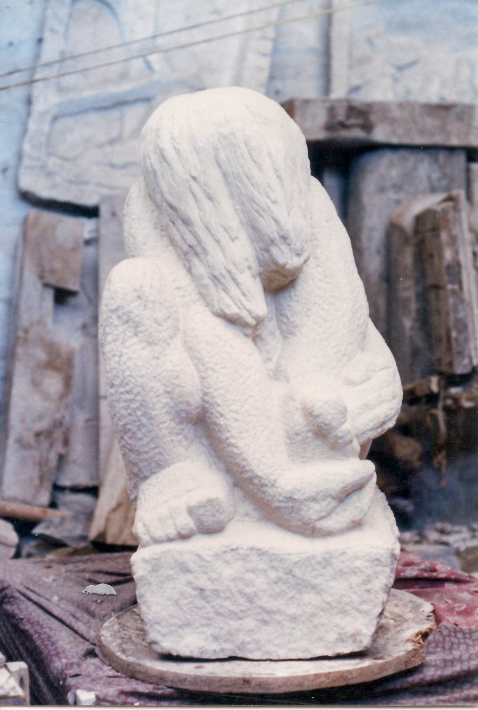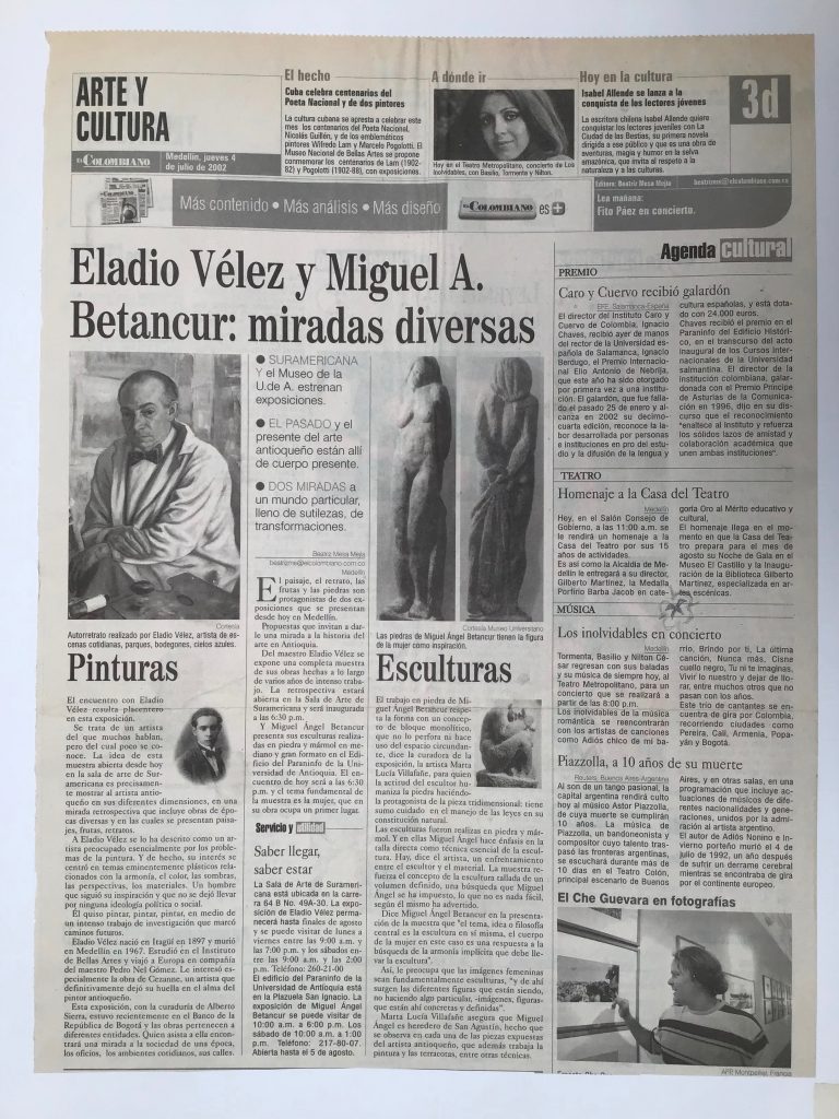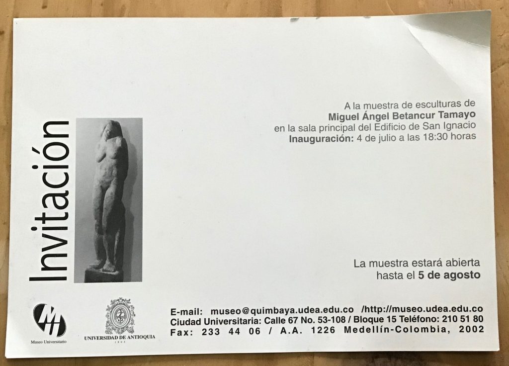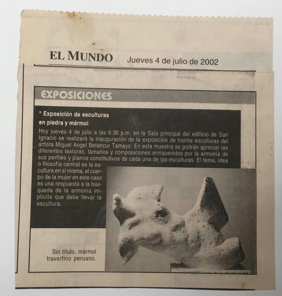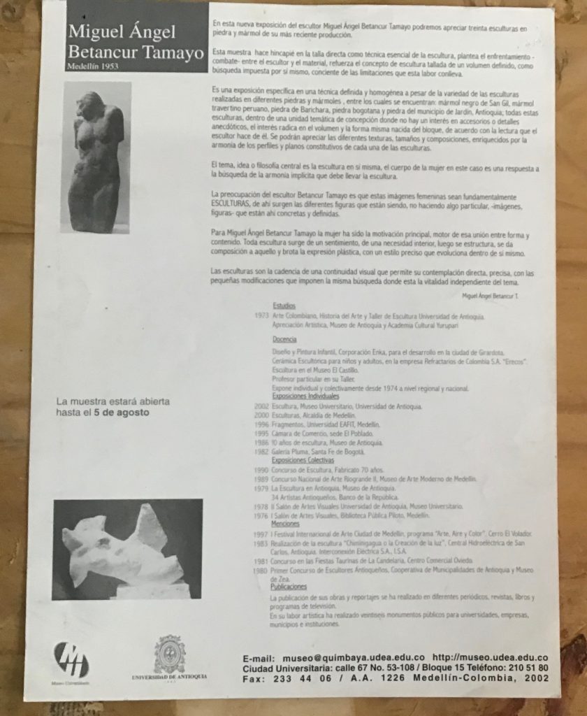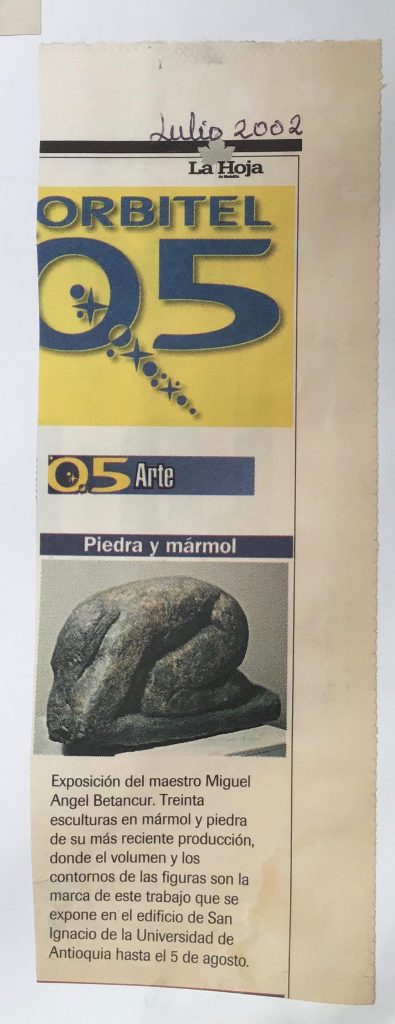Ya en el 2002 expuse individualmente 32 esculturas en piedra y mármol en el Paraninfo de la Universidad de Antioquia, Edificio San Ignacio en ésta exposición me afino más a la idea de ser heredero de la escultura Agustiniana por el emblocamiento y el tratamiento dado a cada escultura ya sea su constitución en piedra o en mármol.