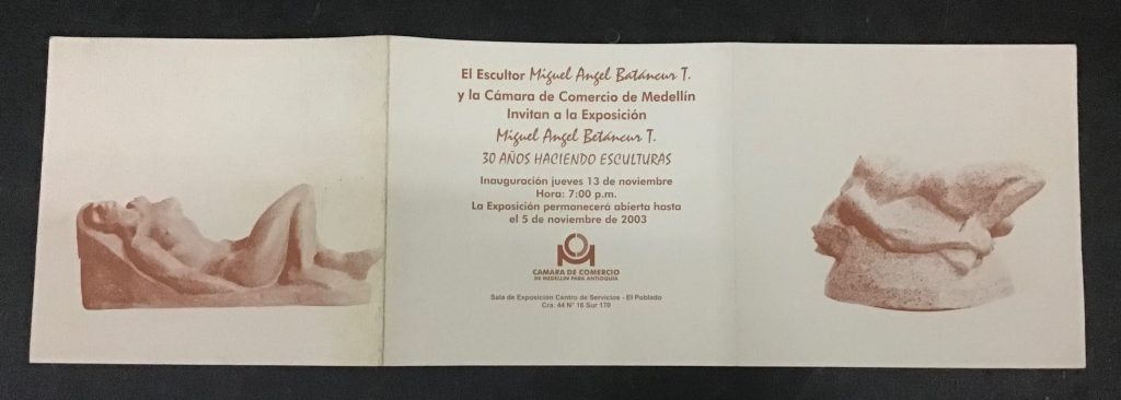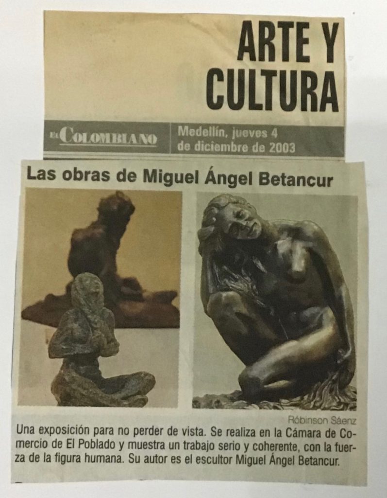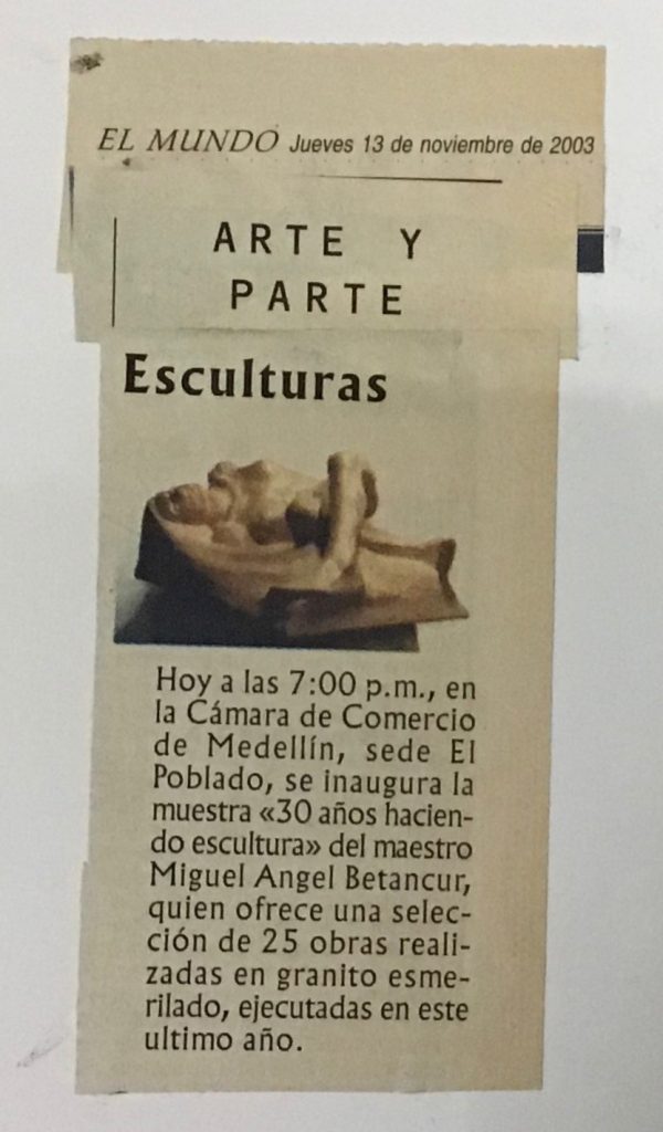 Ya en el año 2003 expuse 25 esculturas en granito esmerilado, por primera vez en nuestra ciudad se ve una exposición de ésta indole, había obras en todos los tamaños y colores, el tema central la Mujer y sus expresiones. El Granito es un material de uso cotidiano y urbano ahora sintetizado en la escultura. La exposición se llevó acabo en la Cámara de Comercio de Medellin sede el Poblado, obras todas realizadas en el taller de Envigado. En ésta exposición presenté además de las 25 esculturas de granito el yeso de la primera escultura de mujer que realicé cuando era estudiante en el Instituto se llama “Dulces recuerdos” para hacer un puente entre la academia y la obra en granito del momento.