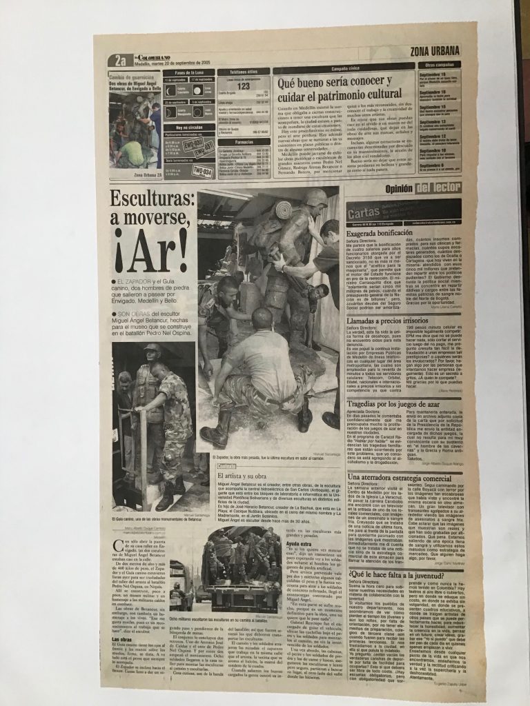 En el año 2005 realicé “EL MONUMENTO A LOS HÉROES CAIDOS EN ACCIÓN” para el Batallón Pedro Nel Ospina del Municipio de Bello, consta de la escultura de los Soldados “GUÍA CANINO” y “EL ZAPADOR” acompañados de los Bustos de “PEDRO NEL OSPINA” Y “EL SABIO CALDAS” son esculturas en concreto patinado y reforzado ejecutadas en el taller de Envigado de 2.20 mts de altura.