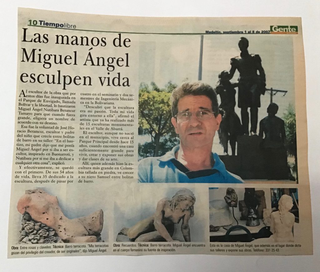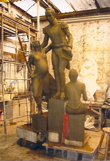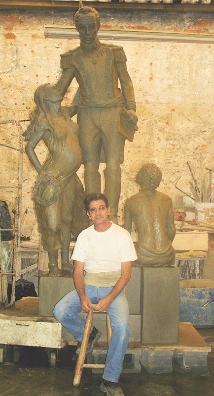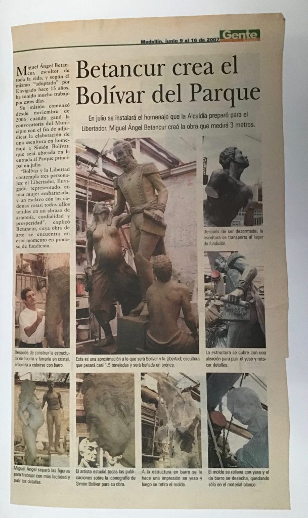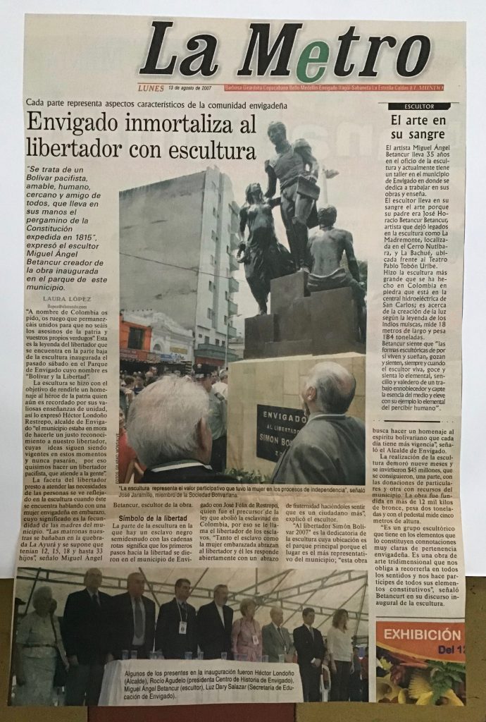En el año** 2006** comienzo la escultura “BOLIVAR Y LA LIBERTAD” para el Parque Principal Marceliano Vélez de Envigado que me fue adjudicada por concurso, una obra de 3 mts de altura en bronce y modelada en barro en mi taller de Envigado, el proceso de la realización de toda la obra demoro nueve meses y en el año 2007se inauguró por parte de la primera autoridad del Municipio El Señor Alcalde Héctor Londoño y sus secretarios de Gabinete con presencia además de los miembros del Concejo y los miembros del Centro de Historia de Envigado y como representante de la Academia de Historia de Medellin estuvo presente el Doctor José María Bravo Betancur.