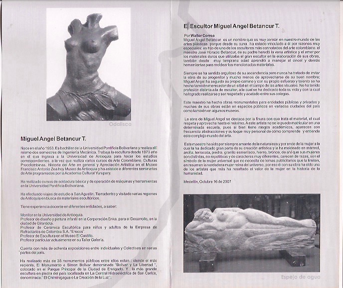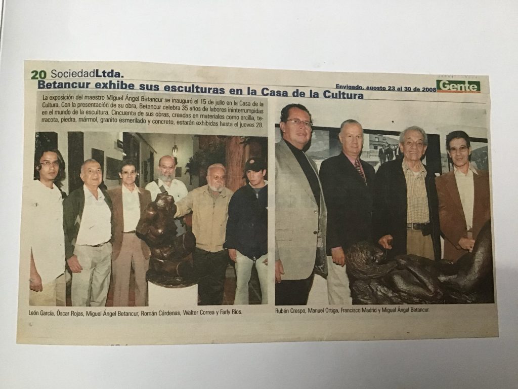 En el año 2008 realicé una exposición individual de esculturas en la Casa de la Cultura Miguel Uribe Restrepo de Envigado, presenté 58 esculturas elaboradas en los 5 últimos años en materiales como la terracota, el granito esmerilado y la piedra, llenaban los corredores, el patio central y el salón Débora Arango, alli se vieron en su verdadera dimensión los altos relieves en granito esmerilado.