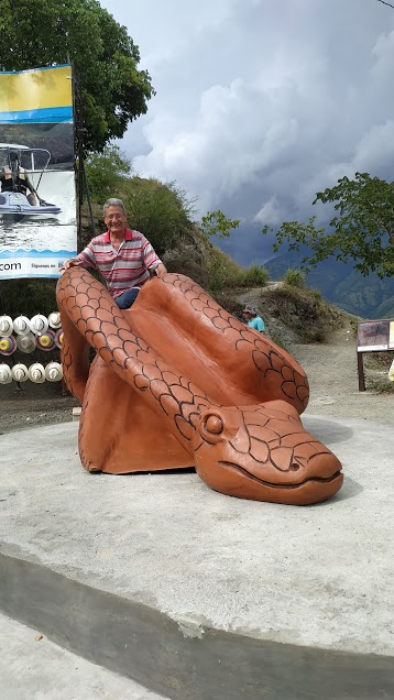 La serpiente en mi escultura se enrolla caprichosamente en forma tubular dándome las posibilidades de jugar con ella y de personificar elementos de la zona: El Rio Cauca esta representado en el tobogan, El Occidente Antioqueño en sus túneles y en el aro que tiene la serpiente en su parte posterior que forma una O el Puente de occidente y su estructura de las torres está signifcada en su color. La topografía del terreno está simbolizada en los diferentes planos, túneles, perfiles y quiebres en zig zag que tiene la escultura, finalmente lo quebrado de sus montañas están recordados en las formas curvas y en la manera de enrollarse que tiene la escultura. Es una escultura simbolica, en un momento pensado estamos viendo las montañas que circundan el lugar y se convierte en una metáfora de lo que es el Occidente Antioqueño.